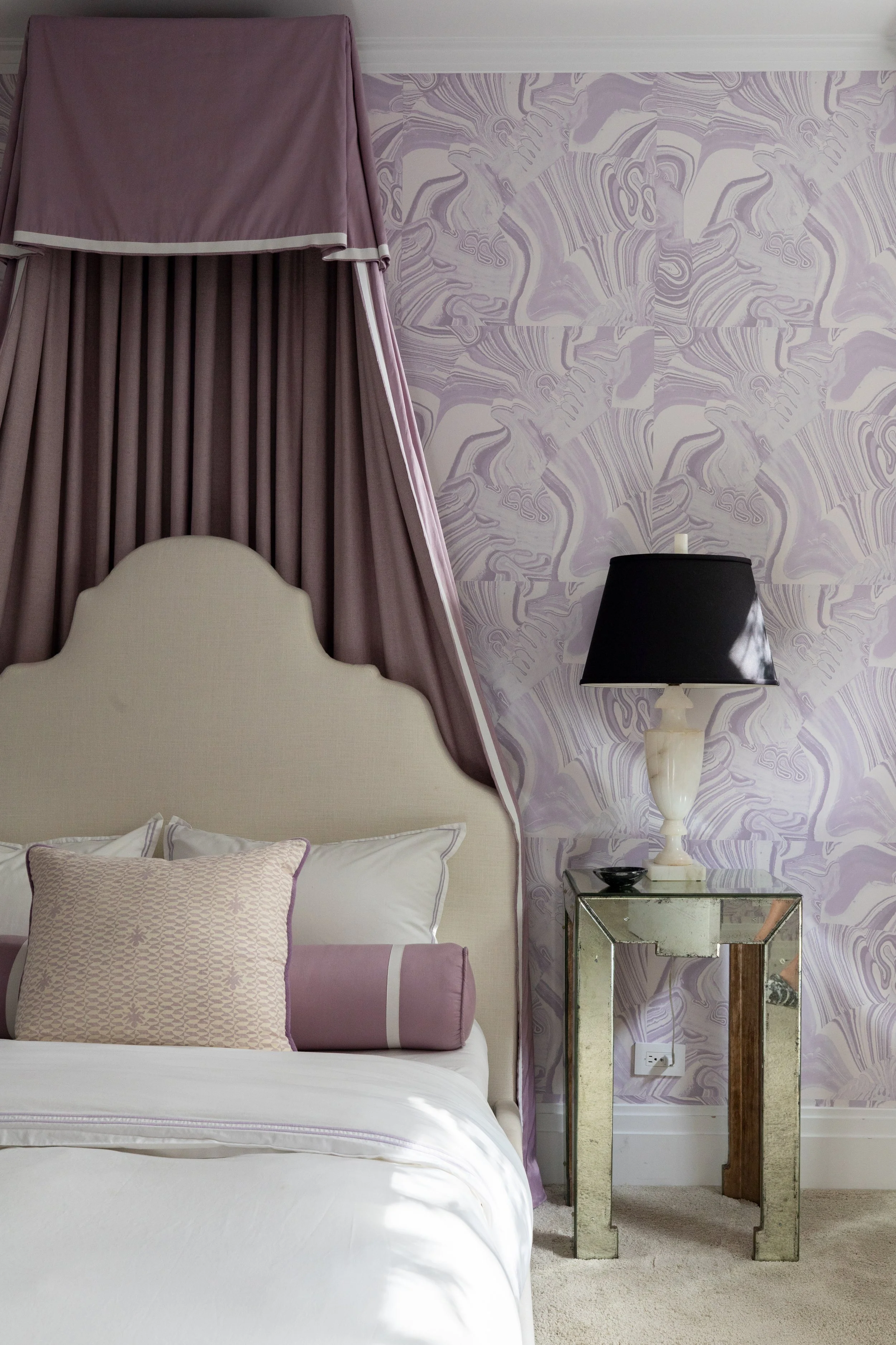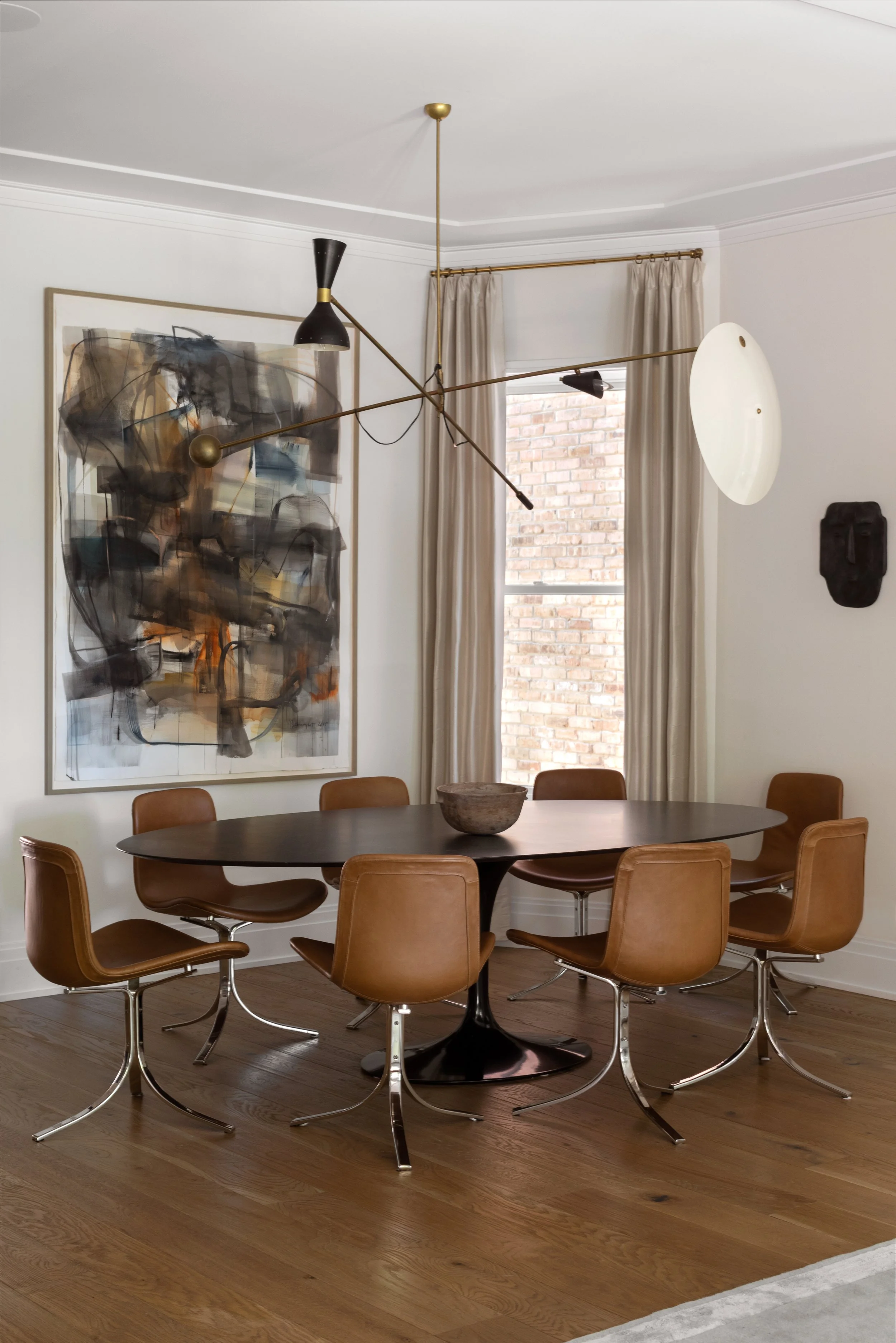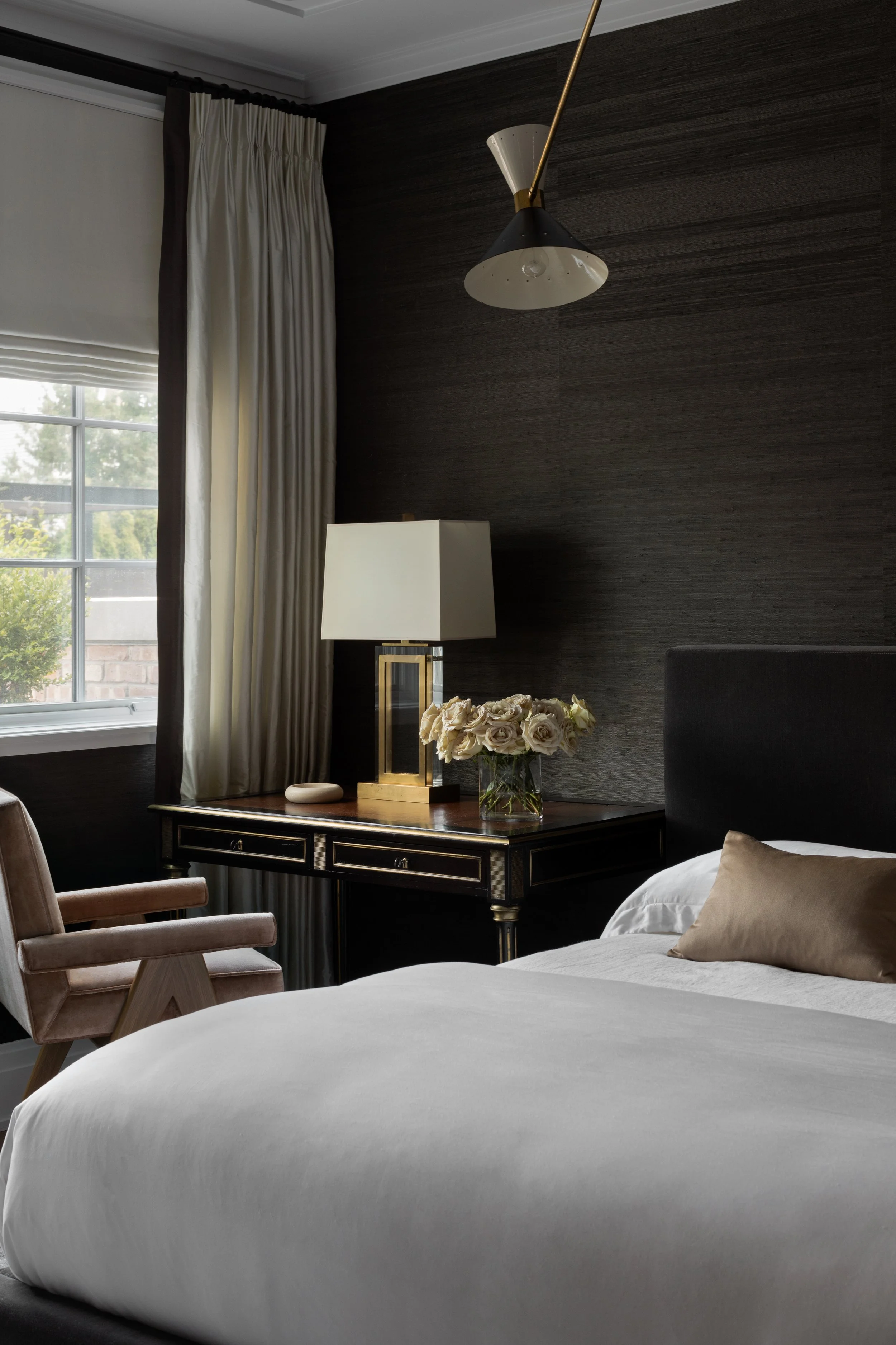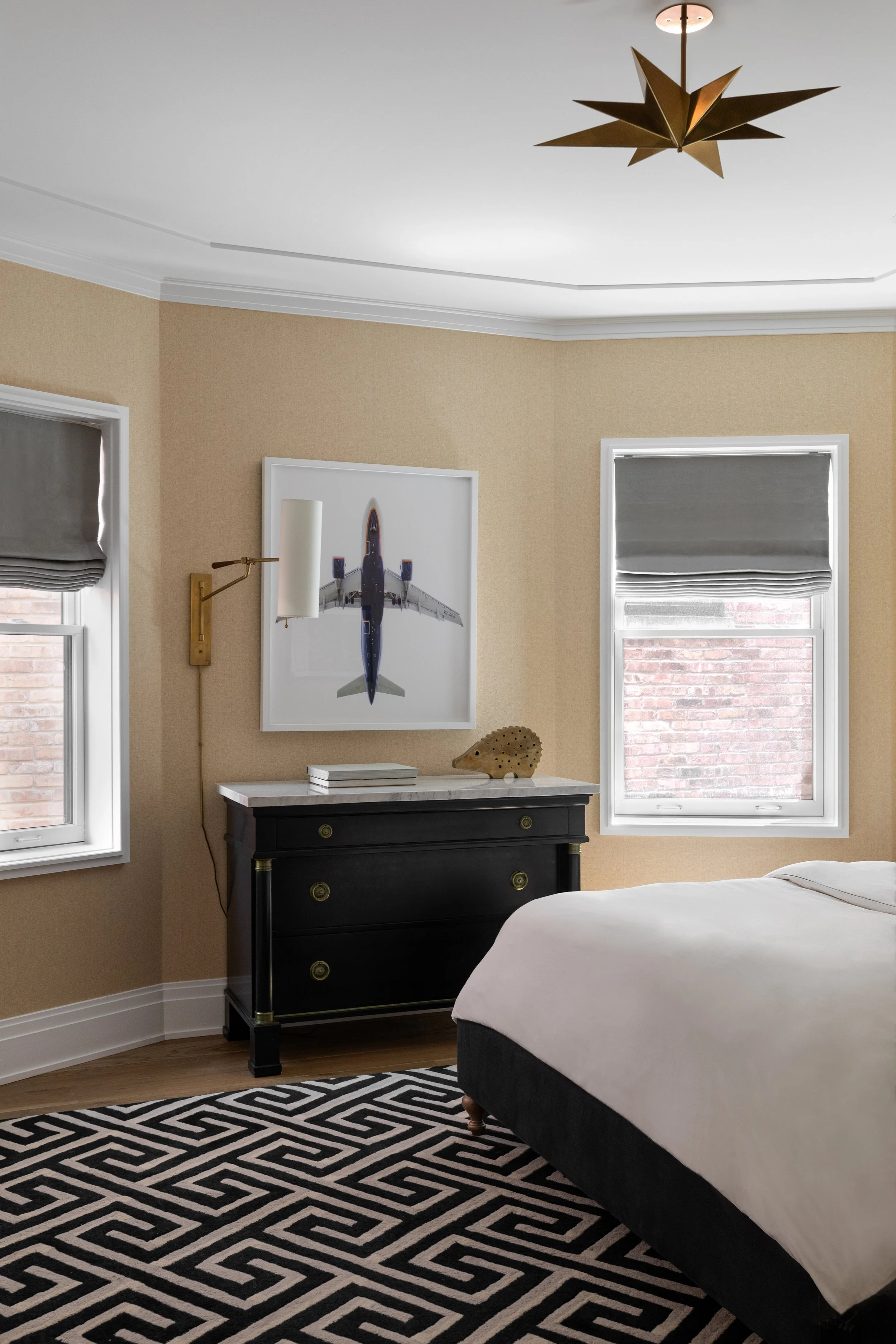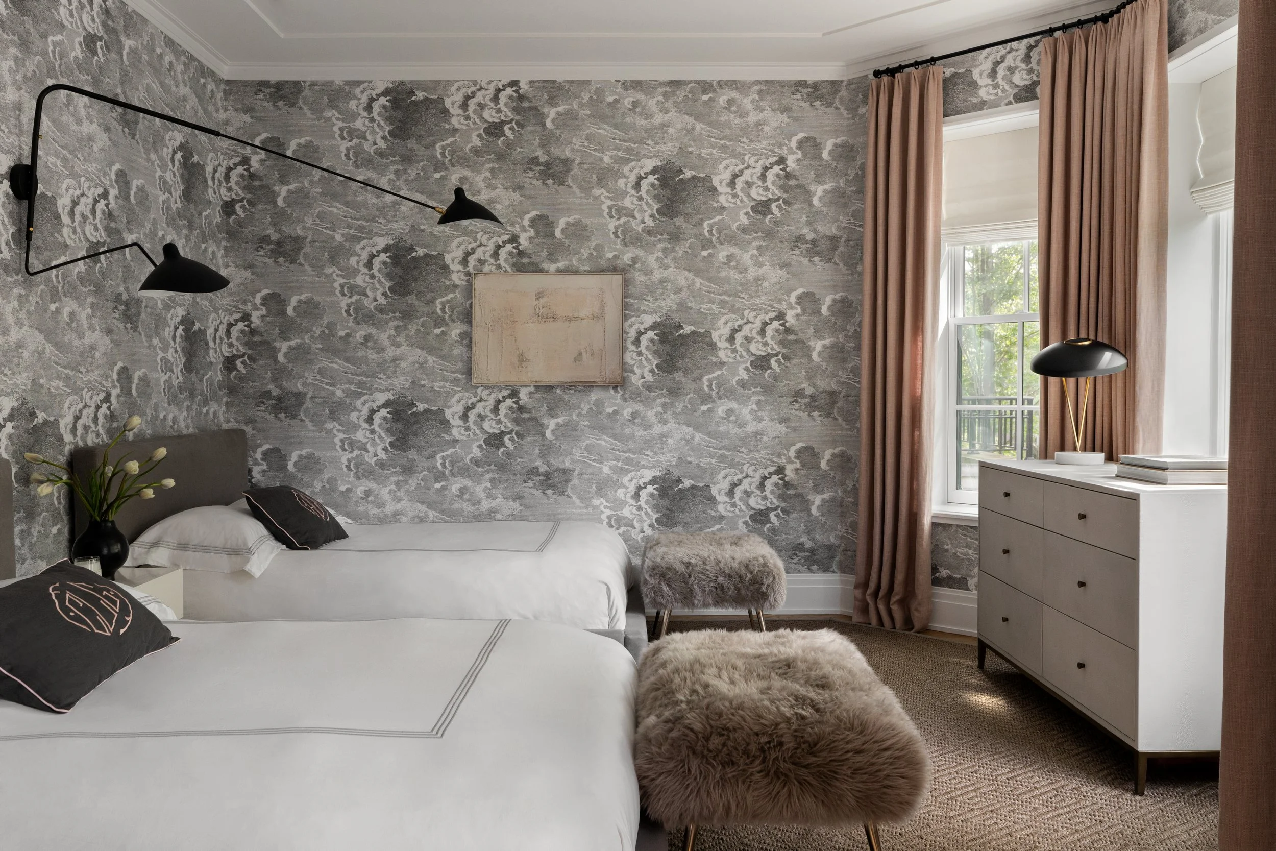 In a city home, spaces flow from front to back and must be beautiful and functional at every point along that axis. Here, the private rooms hew traditional — antique commodes and desks, vintage Italian pendants — while the shared spaces lean contemporary. The dining room brings the two into conversation: iconic midcentury pieces alongside antique French elements, striking enough to delight the eye but relaxed and functional, designed with everyday family meals in mind. The children received thoughtful personal touches in their bedrooms — aviation art for a plane-obsessed boy and a whimsical cloud wallpaper appropriate for growing twins. All six enjoy one of the home’s signature touches: a plush ten-foot sofa custom-made to hold them all at once.Lakeview | Chicago, IL